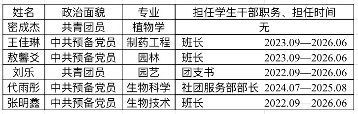 根据学校组织部要求,生命科学与技术学院决定推荐6人(制药工程专业(工科类专业)名额为1人,园林专业(农学类专业)名额为1人,园艺专业(农学类专业)名额为1人,其他专业名额为研究生1人、本科生2人)。按照排名分别为密成杰 王佳琳 敖馨爻 刘乐 代雨彤 张明鑫 。本次推荐人员名单不是最终名单,是否通过以省里审核为准,如省里审核未通过还需要按照排名顺延。