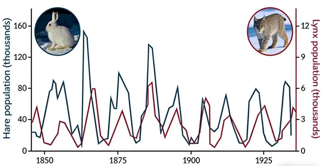更有趣的是,两者的种群数量呈现出惊人的周期性同步波动。每隔9到10年,雪兔的数量会达到峰值,随后因食物短缺和天敌捕食急剧下降;而当雪兔数量锐减时,猞猁的繁殖率会大幅降低,幼崽成活率也随之下降,部分猞猁甚至会因饥饿而迁徙或死亡。