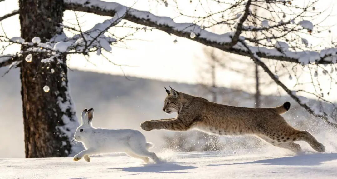 猞猁是典型的猫科动物,身形矫健,能在皑皑白雪上悄无声息地行走。而雪兔凭借极强的繁殖能力,成为了最常见的“移动粮仓”。对猞猁而言,雪兔是它们的主要猎物,在猞猁的食谱中占比高达90%以上。猞猁常潜伏在灌丛间,一旦雪兔进入视野,便会以闪电般的速度扑出,精准锁喉。