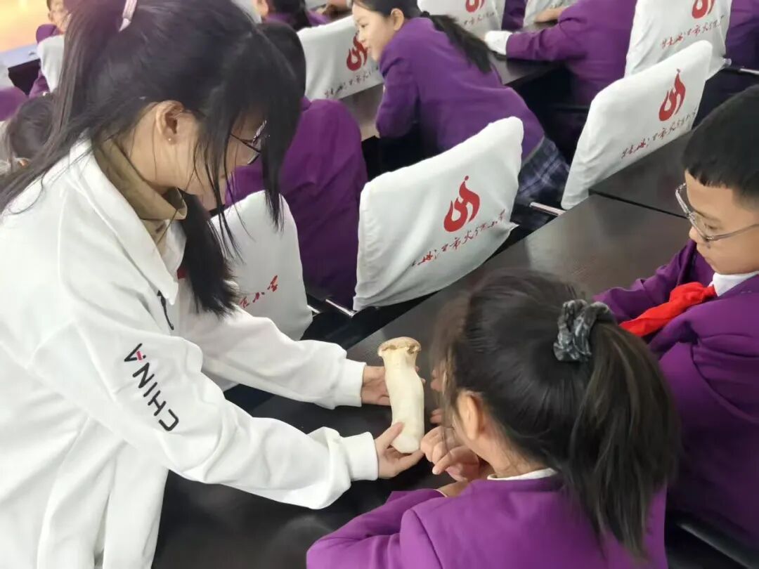在科普知识环节,志愿者围绕蘑菇的生长特点与生长条件展开细致讲解,缓缓揭开真菌世界的神秘面纱,有效激发了学生们对自然科学的热爱与探索精神。志愿者还借助精美的模型与生动的解说,进一步拓宽了学生们探索微观世界的视野。
