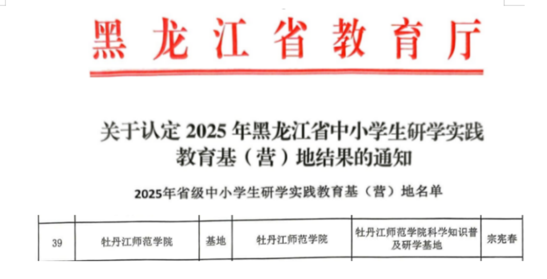 近日,黑龙江省教育厅公布2025年黑龙江省中小学生研学实践教育基地申报认定结果,由我院申报的“牡丹江师范学院科学知识普及研学基地”成功获批。