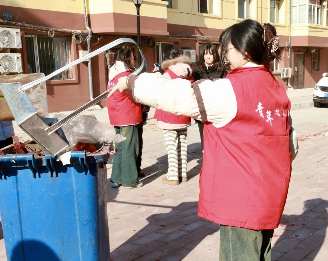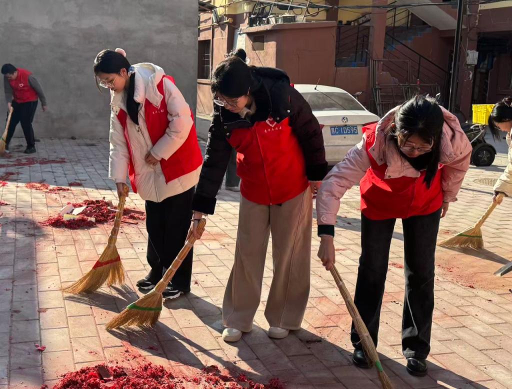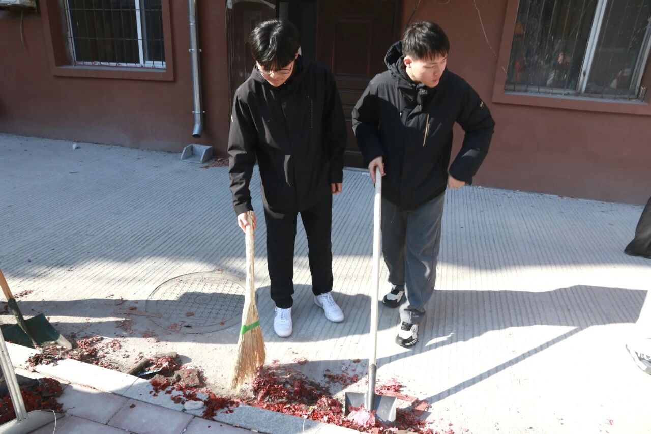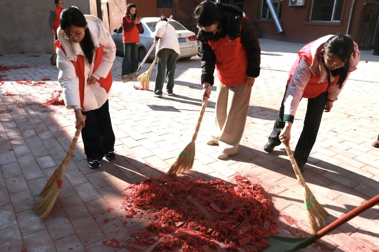 志愿者们深入利民社区,积极投身环境清洁工作,手持扫帚与簸箕,对社区楼前空地展开全面清扫。大家分工协作、默契配合,将残留的大量鞭炮屑进行细致清理,不放过任何一处卫生死角。