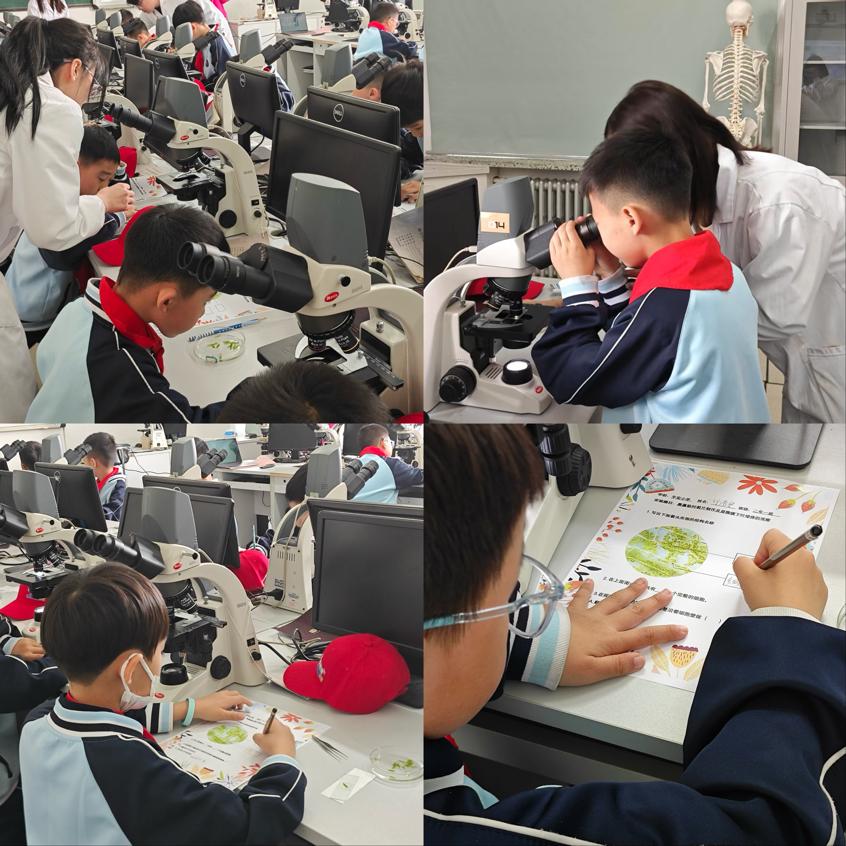 参观完组培室,学生在研究生志愿者的悉心指导下有序开展光学显微镜操作实践活动。志愿者们以简明易懂的方式介绍有关叶绿体的知识,并手把手引导学生掌握显微镜调焦、标本观察等基础操作技巧。在观察黑藻叶片实验中,学生们通过显微镜镜头首次直观窥见黑藻胞质环流现象,对叶绿体的形态及运动特征形成具象认知。实验结束后,学生们认真完成观察记录卡的填写,用稚嫩的笔触描绘观察到的微观画面。此次实践活动以寓教于乐的方式,有效培养了学生的科学观察能力与动手实践能力,激发了低年级学生探索微观世界的浓厚兴趣,为科学启蒙教育积累有益实践经验。