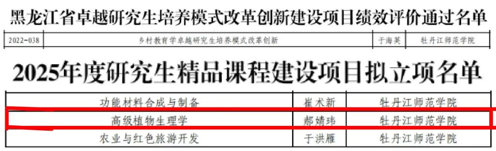 近日,黑龙江省教育厅公布2025年度省级研究生精品课程建设项目立项名单,我院郝婧玮老师主持建设的研究生课程《高级植物生理学》成功入选,实现学院省级研究生精品课程建设新突破。