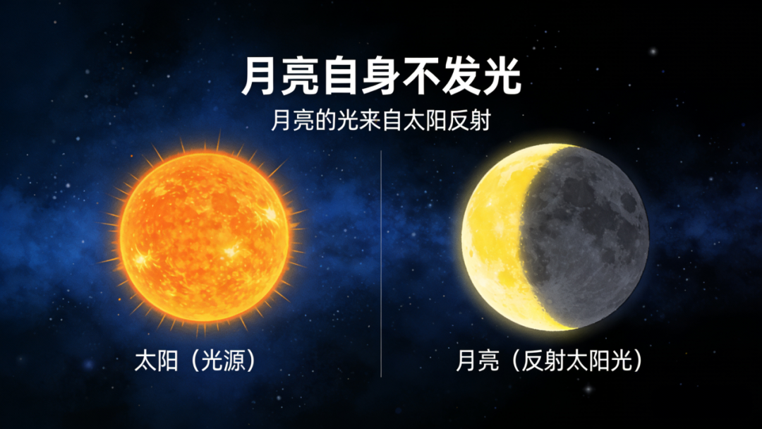 月亮并不是一颗可以自主发光发热的恒星,它本身没有光源,我们在地球上看到的明亮月光,全部来自月球表面对太阳光的反射。太阳作为光源,会稳定地照亮月球的半个球面,无论月球如何运动,永远只有一半处于光照区,另一半处于阴影区。这是月相形成的最根本前提,也决定了我们看到的月亮,始终只是被太阳照亮的一部分,而非完整的月球本体。